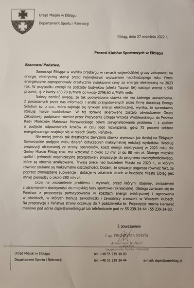 Już 27 września 2022 r. prezesi klubów sportowych otrzymali pismo z Departamentu Sportu i Rekreacji, podpisane przez dyrektora Arkadiusza Kolperta z upoważnienia prezydenta Elbląga, w sprawie oszczędzania energii.