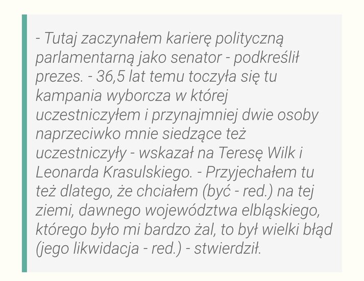 - Tutaj zaczynałem karierę polityczną parlamentarną jako senator - podkreślił prezes. - 36,5 lat temu toczyła się tu kampania wyborcza w której uczestniczyłem i przynajmniej dwie osoby naprzeciwko mnie siedzące też uczestniczyły - wskazał na Teresę Wilk i Leonarda Krasulskiego. - Przyjechałem tu też dlatego, że chciałem (być - red.) na tej ziemi, dawnego województwa elbląskiego, którego było mi bardzo żal, to był wielki błąd (jego likwidacja - red.) - stwierdził.