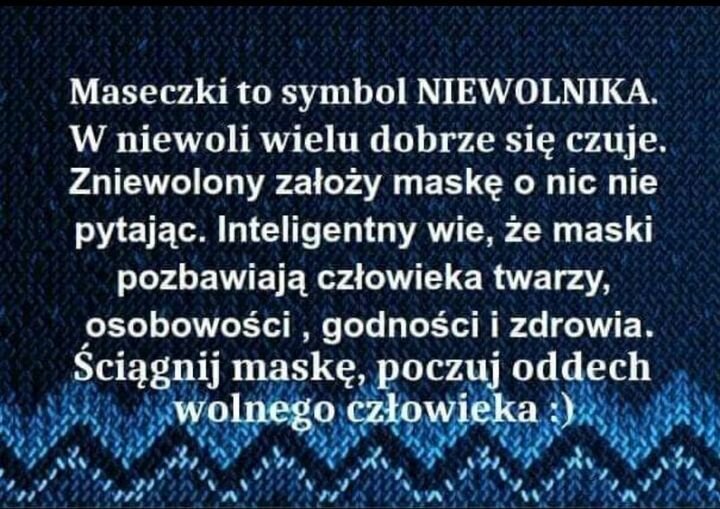 • Najbardziej wrażliwi i wyczuleni na wszelkie ograniczenia są właśnie niewolnicy. Nawet nakaz noszenia maseczki przypomina im ich niewolnicza naturę i piszczą, skaczą, protestują. Wolny człowiek żyje po swojemu i robi co do niego nalezy
