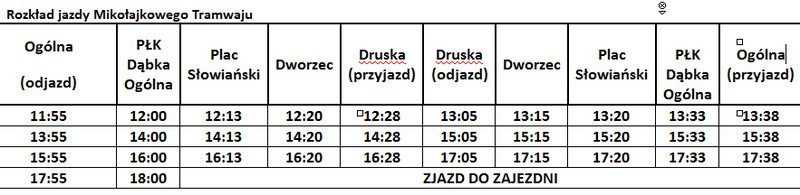 W godzinach popołudniowych w tramwaju będzie można spotkać Prezydenta, który dzieciom będzie rozdawał elbląskie upominki. Szczegółowy rozkład jazdy Mikołajkowego Tramwaju poniżej.
