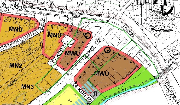 - Przedmiotowy teren, oznaczony w ewidencji gruntów i budynków w obr. 17 jako działki nr 120/2 i 121, administrowany jest przez Zarząd budynków Komunalnych i w znacznej jego części stanowi przedmiot umów najmu/dzierżawy – odpowiada wiceprezydent Elbląga. - Nieruchomość położona jest na obszarze, dla którego obowiązują ustalenia miejscowego planu zagospodarowania przestrzennego rejonu ulic Łęczyckiej i Sadowej w Elblągu, zgodnie z którym znaczna jej część przeznaczona jest pod teren dróg publicznych. Natomiast pozostała część nieruchomości stanowi tereny zabudowy mieszkaniowej wielorodzinnej z udziałem usług, a także tereny zieleni urządzonej – podkreśla Michał Missan. Do odpowiedzi dołącza zamieszczony obok wycinek z rysunku planu (pod tekstem).